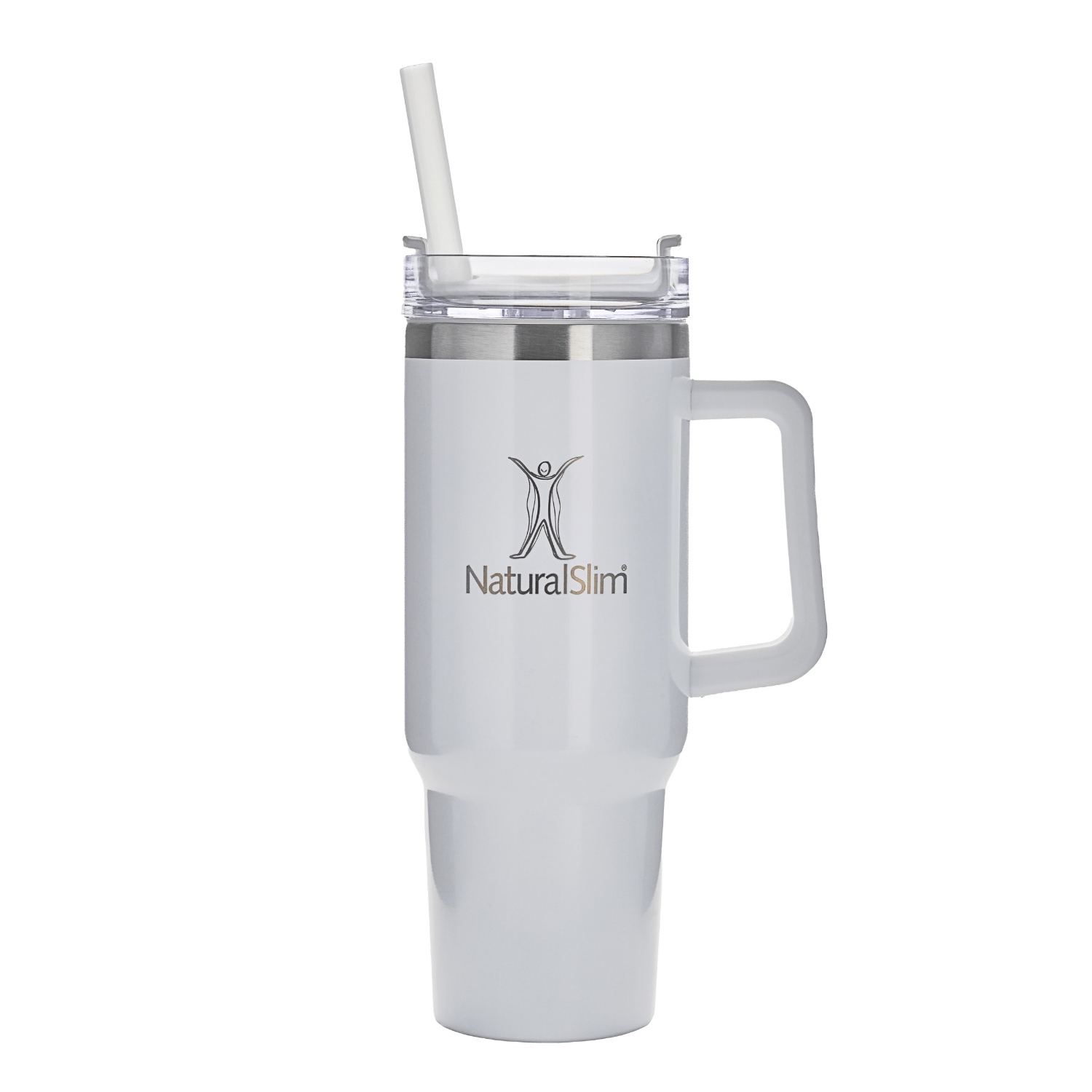 El Tumbler de NaturalSlim® está diseñado para ser su aliado en el camino hacia una correcta hidratación, ayudándole a alcanzar su meta diaria de agua mientras respalda la producción de energía en su cuerpo. Con una capacidad de 40 onzas (1.2 litros), este vaso térmico combina estilo, funcionalidad y durabilidad para mantenerse hidratado de forma cómoda y constante.